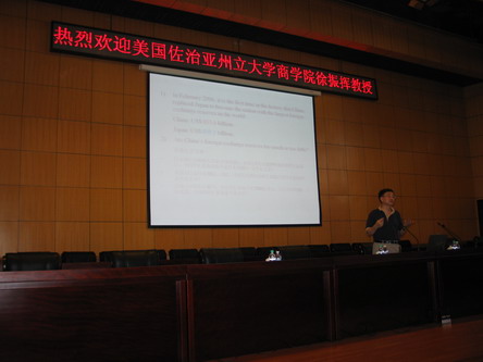 应国际合作处与经济学院邀请,美国佐治亚州立大学商学院徐振挥教授(博士)于2006年6月23日在学校A区国际会议厅举办了《中国汇率政策和中美贸易差额的关系》学术讲座。