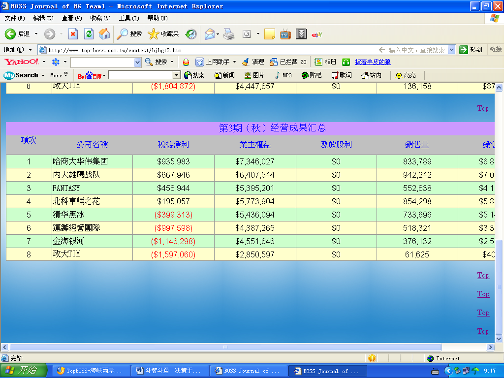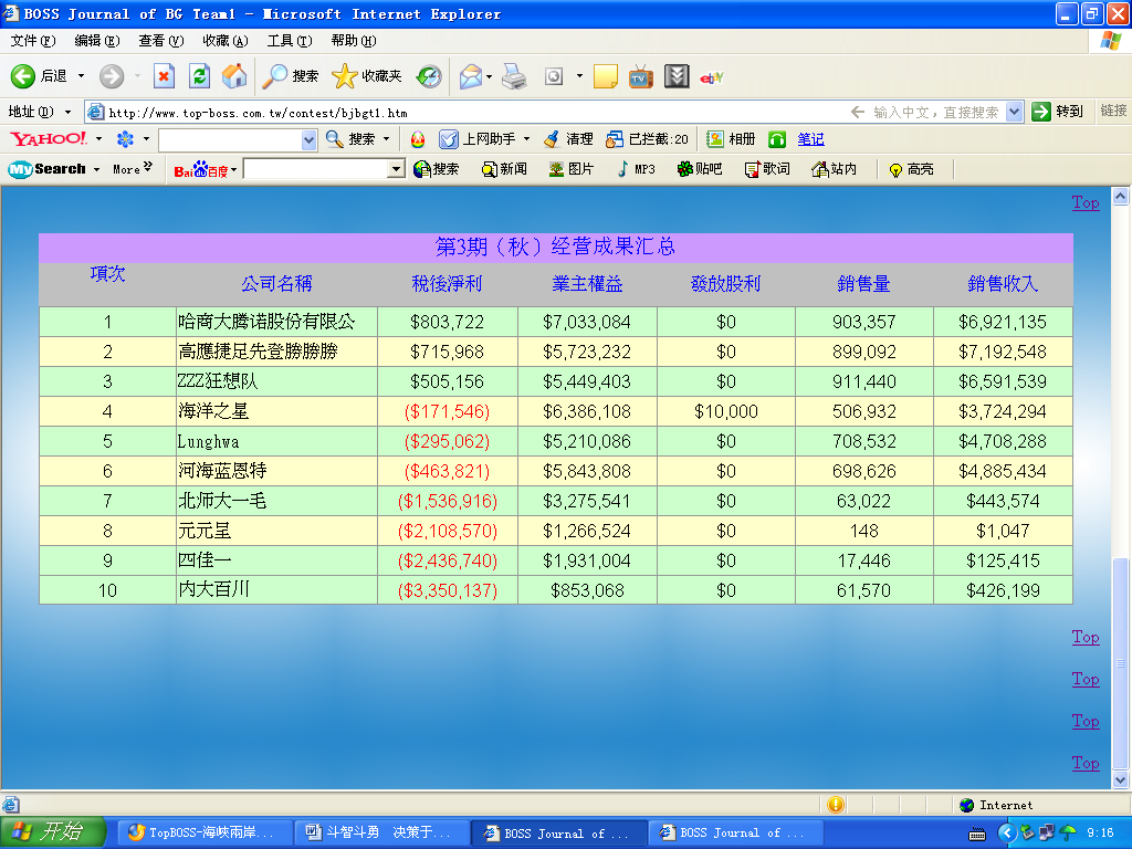 我校参加第二届海峡两岸模拟经营友谊赛的团队是哈商大腾诺股份和哈商大华伟集团,他们是全校首届模拟经营大赛一、二等奖的获得者。在第一赛区和腾诺股份同台竞技的是高雄科技大学、北京师范大学、浙江大学、河海大学等学校的队伍,在第二赛区和华伟集团较量的队伍来自清华大学、北京科技大学、中国政法大学等学校的队伍。教务处十分重视这次比赛,张莉副处长在百忙之中亲自担任比赛顾问,鲁啸军副教授担任本次比赛的总指导,并派专门的老师协调比赛事宜。经过一个星期的紧张决策、在激烈的市场争夺、价格竞争等商业大战中,我校两支队伍脱颖而出,经营成果遥遥领先于其他队伍,华伟集团已经在预赛中以980万的业绩理论上从88支队伍提前出线,腾诺股份与去年比赛的亚军正在进行激烈的争夺,并领先100多万,如无异常情况,将以小组第一的成绩进入前八名。(章刘成)