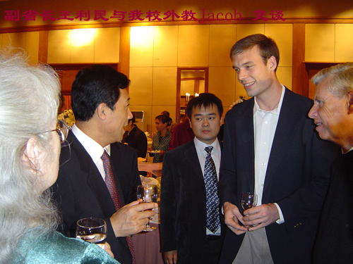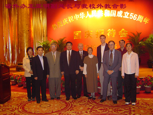 9月29日,国际合作处徐晓菲、徐冰若带领我校Robert Nai-young Chan等8名美籍教师,参加了由省政府主办的,在新加坡大酒店举行的中华人民共和国建国56周年全省外籍专家国庆招待会。省政府副省长王利民首先发表了热情洋溢的讲话:感谢外国专家教师为我省的经济、文化教育和社会发展做出的贡献,并希望他们继续发挥聪明才智,在所在的领域和岗位上做出更大的贡献。招待会期间,副省长王利民来到我校外教中间,询问了他们工作和生活情况。省外事办公室领事专家处王亚明副处长与我校外教合影留念。我校外教还与其他院校的外教进行了交流。会上自始至终洋溢着节日的喜庆气氛。