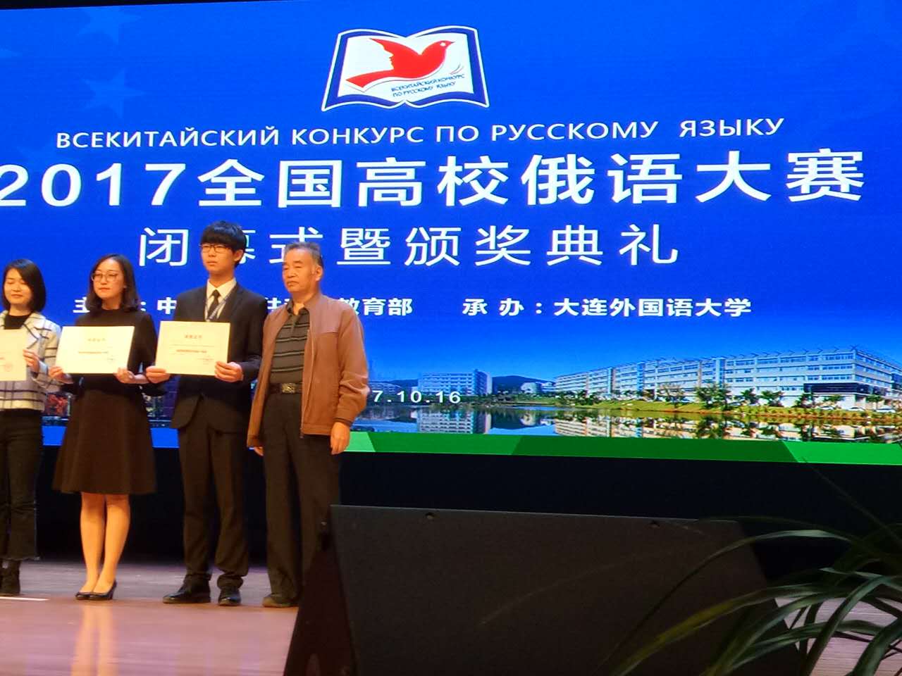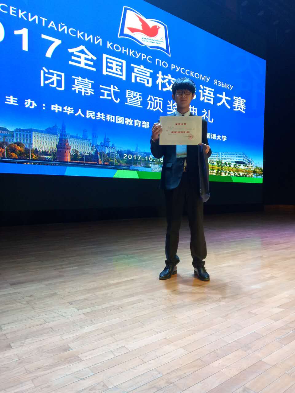 在刚刚结束的2017年全国高校俄语大赛演讲比赛中,我校外语学院俄语专业16级学生姜铎以总分第一名的优异成绩,荣获一等奖。