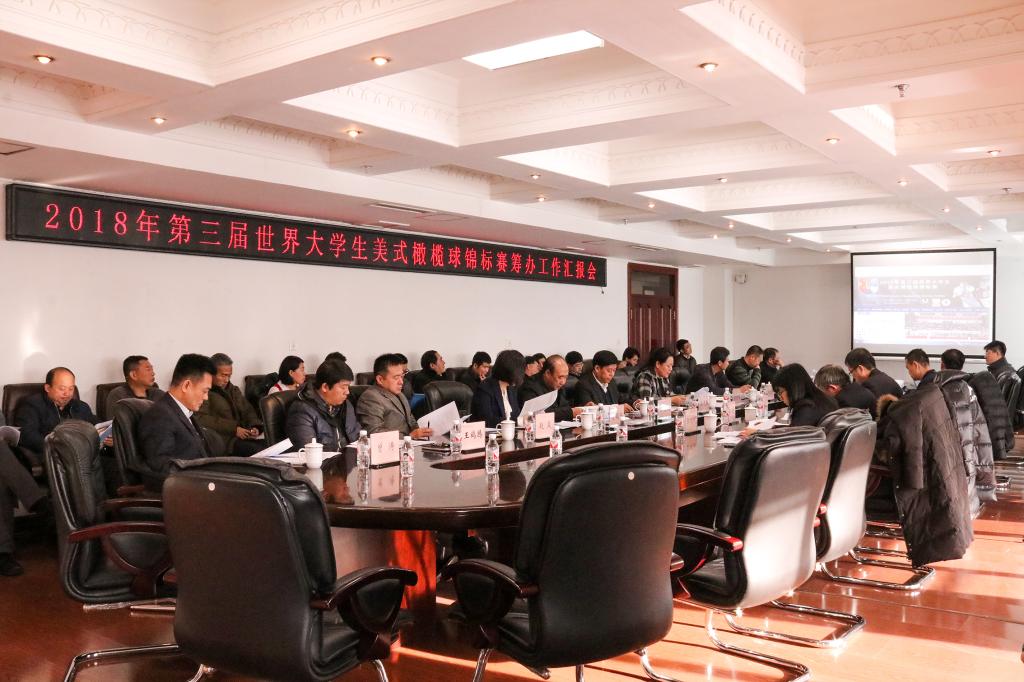 12月11日上午,我校在三楼会议室召开2018年第三届世界大学生美式橄榄球锦标赛筹办工作汇报会。教育部学生体育协会联合秘书处副秘书长、中国大学生体育协会副主席张爱龙,教育部学生体育协会联合秘书处办公室副主任张汉,教育部学生体育协会联合秘书处项目主管张利娜,黑龙江省教育厅副厅长李云增及赛事筹委会各部负责人出席会议。我校党委书记、筹委会主席孙先民主持会议。