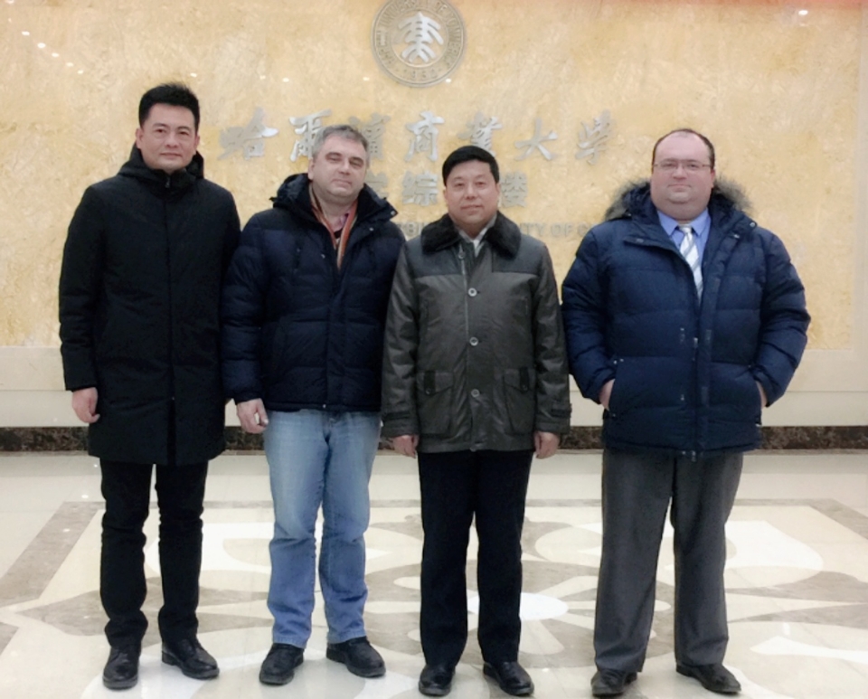 2017年12月5日孙先民书记在哈尔滨商业大学江北校区教学综合楼会见远东联邦大学师范学院院长皮顺·谢尔盖和副院长布别·弗拉基米尔。