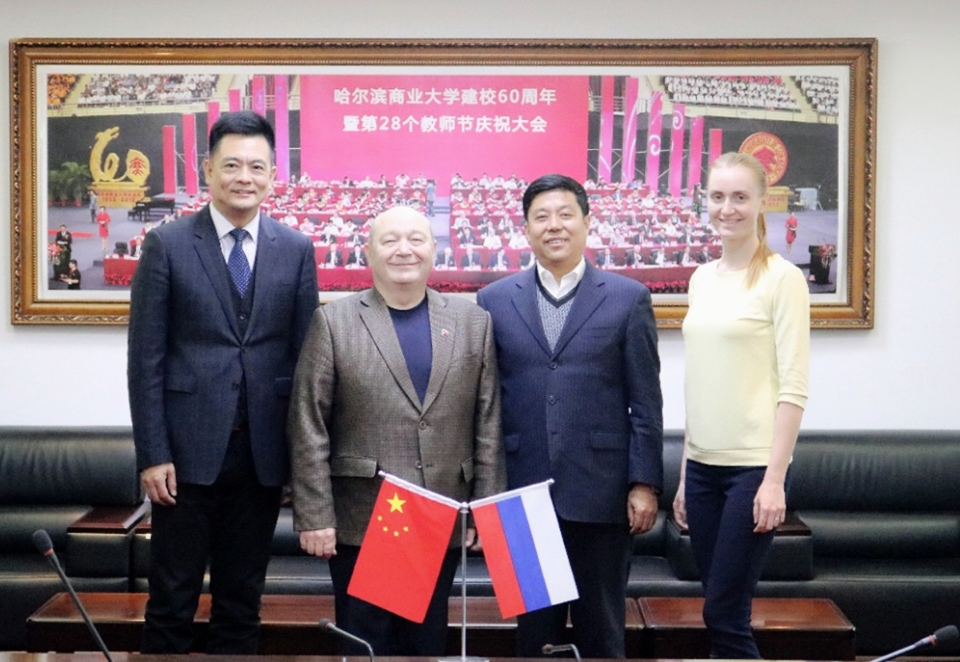 下午14:00,双方领导及相关部门负责人在江北行政楼四楼会议室举行会谈。孙先民书记代表哈尔滨商业大学对阿穆尔国立人文师范大学副校长一行来访表示欢迎,并将学校的基本情况向代表团作了介绍。孙先民书记指出,随着中俄贸易往来的不断加强,对懂中俄法律人才的需求日益增强,希望今后两校可以加强师生在法律领域方面的交流与培训,为今后中俄经贸的健康发展提供法律人才保障。科什金·安德烈副校长在对孙先民书记的观点表示赞赏的同时也希望两校可以在其他领域开展合作,如共同出版刊物,培养精通中俄文的双语导游等方面。科什金副校长代表巴维金校长邀请孙先民书记到阿穆尔国立人文师范大学访问,孙先民书记感谢巴维金校长的盛情邀请,并表示会在方便的时候到阿穆尔国立人文师范大学访问。