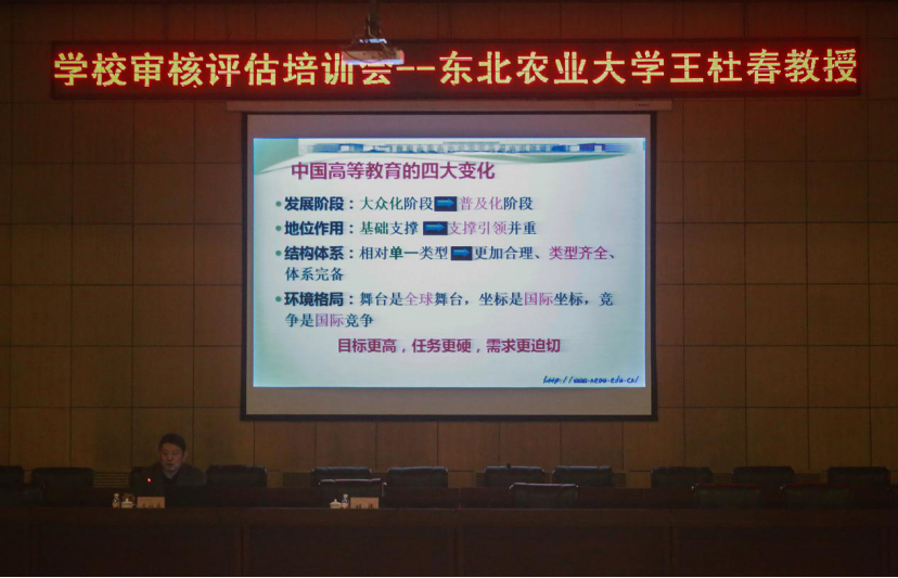 为进一步强化评估意识,明确评估任务,掌握评估各环节工作要求,按照学校评建工作进程和前期准备情况,12月29日下午,教育部审核评估专家、东北农业大学教务处长王杜春教授应邀来到我校,以“对本科教学工作审核评估的认识与体会”为题作了专题讲座,讲座由程伟副校长主持。副校长于树彬、校纪检委书记姜国峰、机关副处级以上干部、各学院领导、教研室主任及副教授以上教师参加了会议。