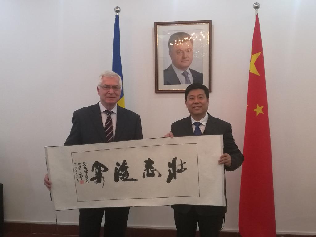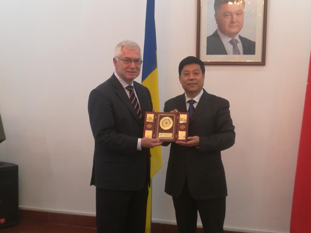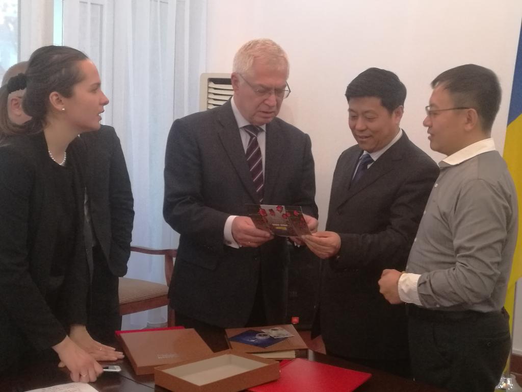 焦明大使邀请孙先民书记参观了乌克兰驻中国大使馆,欣赏了乌克兰传统手工刺绣及木盘漆画作品。并向孙书记赠送了漆盘。孙先民书记以商大艺术设计学院的书法作品和校徽回赠焦明大使。