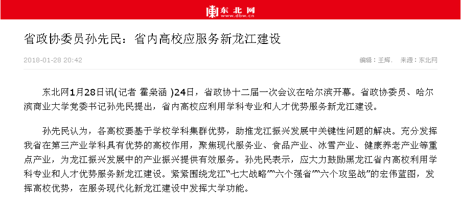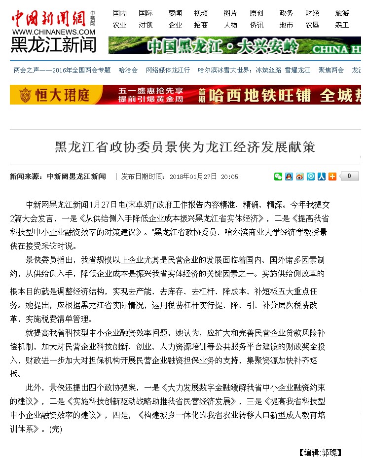 “两会”期间,我校的代表、委员围绕黑龙江省高等教育人才培养、民营企业扶持、中小企业融资、创新创业与产教融合、对外开放体系构建、国际化俄语人才培养与储备、高校优质科研资源向社会开放等关乎龙江人才、民生、金融、经济等领域的问题积极建言献策、参政议政,提交提案和议案13份,受到各大新闻媒体广泛关注。人民网、中国新闻网、黑龙江电视台、黑龙江日报、东北网、黑龙江画报等多家媒体对我校省人大代表、省政协委员参会情况、建言献策情况进行了采访和报道,累计宣传报道近20条(次)。