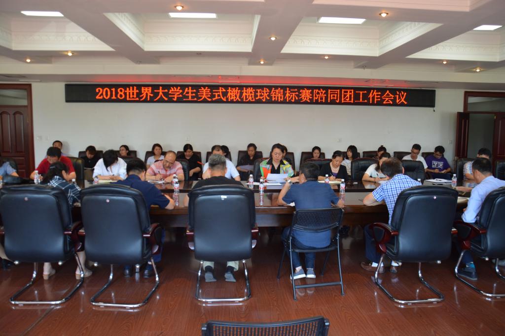 5月31日下午,2018世界大学生美式橄榄球锦标赛陪同团对接会议在哈尔滨商业大学行政楼3楼会议室召开。组委会各部办主要负责人,陪同团负责人及陪同团师生代表参加会议。组委会秘书长、哈尔滨商业大学工会主席李晓梅主持会议并讲话。
