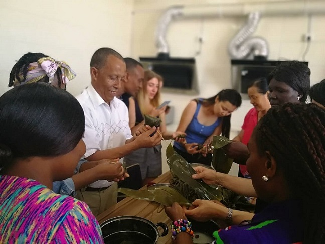 6月12日上午,国际教育学院留学生的厨房里弥漫着清新的粽香。来自韩国、俄罗斯、哈萨克斯坦、津巴布韦、加纳、埃塞俄比亚、尼泊尔、南苏丹等16个国家的60余名留学生,与老师们欢聚一起,共同学习包粽子,迎接端午佳节的来临。