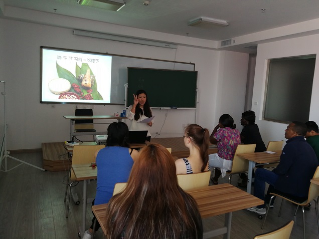 包粽子之前,国际教育学院的老师先给学生们上了一堂关于端午节的文化课。端午节又叫五月节和端阳节,是中国的四大传统节日之一。端午节这一天,各地往往会举办赛龙舟、插艾草、包粽子等一系列活动纪念诗人屈原,另外还有挂菖蒲、熏艾草、喝雄黄酒等风俗。北方人一般在粽子里放大枣或者豆沙,南方人则喜欢包肉粽和咸蛋黄棕。以各种形式寄托对亲人的思念之情。