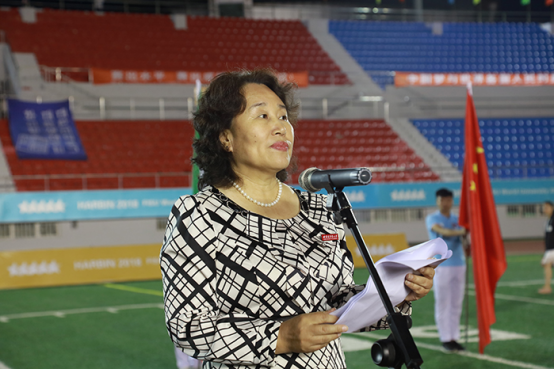 2018世界大学生美式橄榄球锦标赛组委会执行主席、哈尔滨商业大学校长郑秋鹛主持闭幕式。