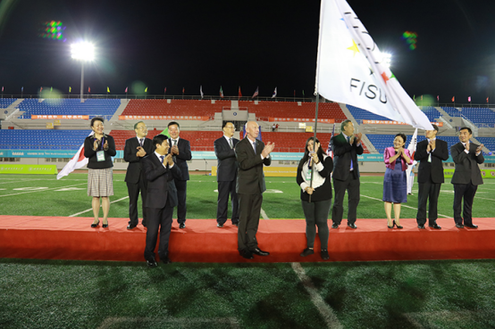 在国际大学生体育联合会会歌声中,国际大学生体育联合会会旗缓缓降下,匈牙利美式橄榄球协会代表安娜女士接过国际大体联会旗,并发表热情洋溢的致辞。