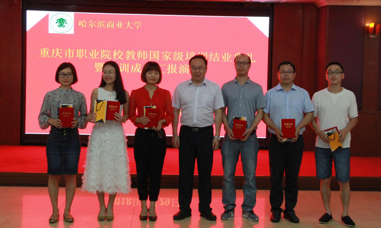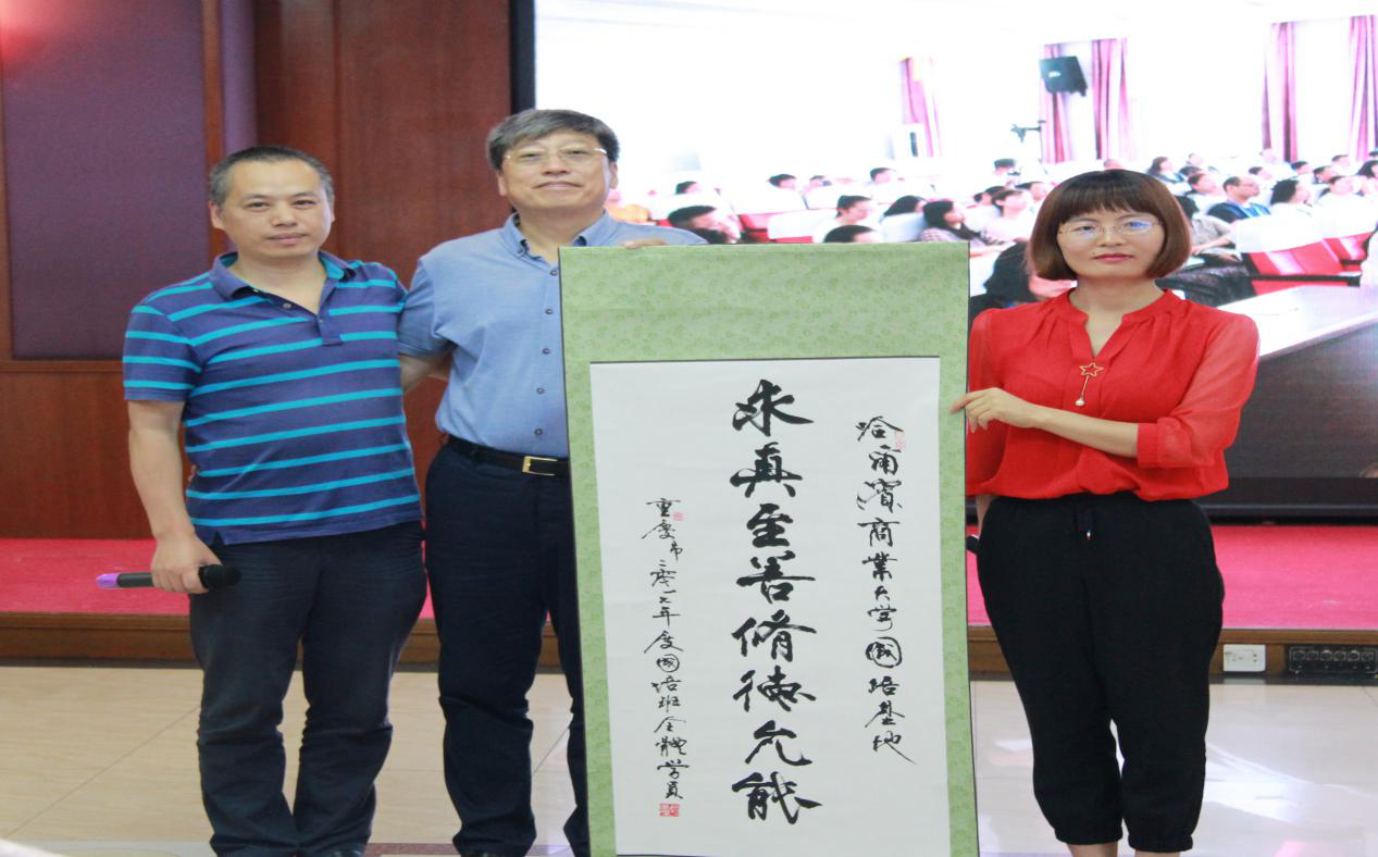 重庆水利水电职业技术学院黄小华老师代表学员向我校基地赠送了《哈商大国培有感》书法作品,以此表达重庆国培学员对哈尔滨商业大学国培工作的高度认可、充分肯定和感谢之情。结业典礼在掌声中圆满的落下帷幕,各位领导、学员合影留念。