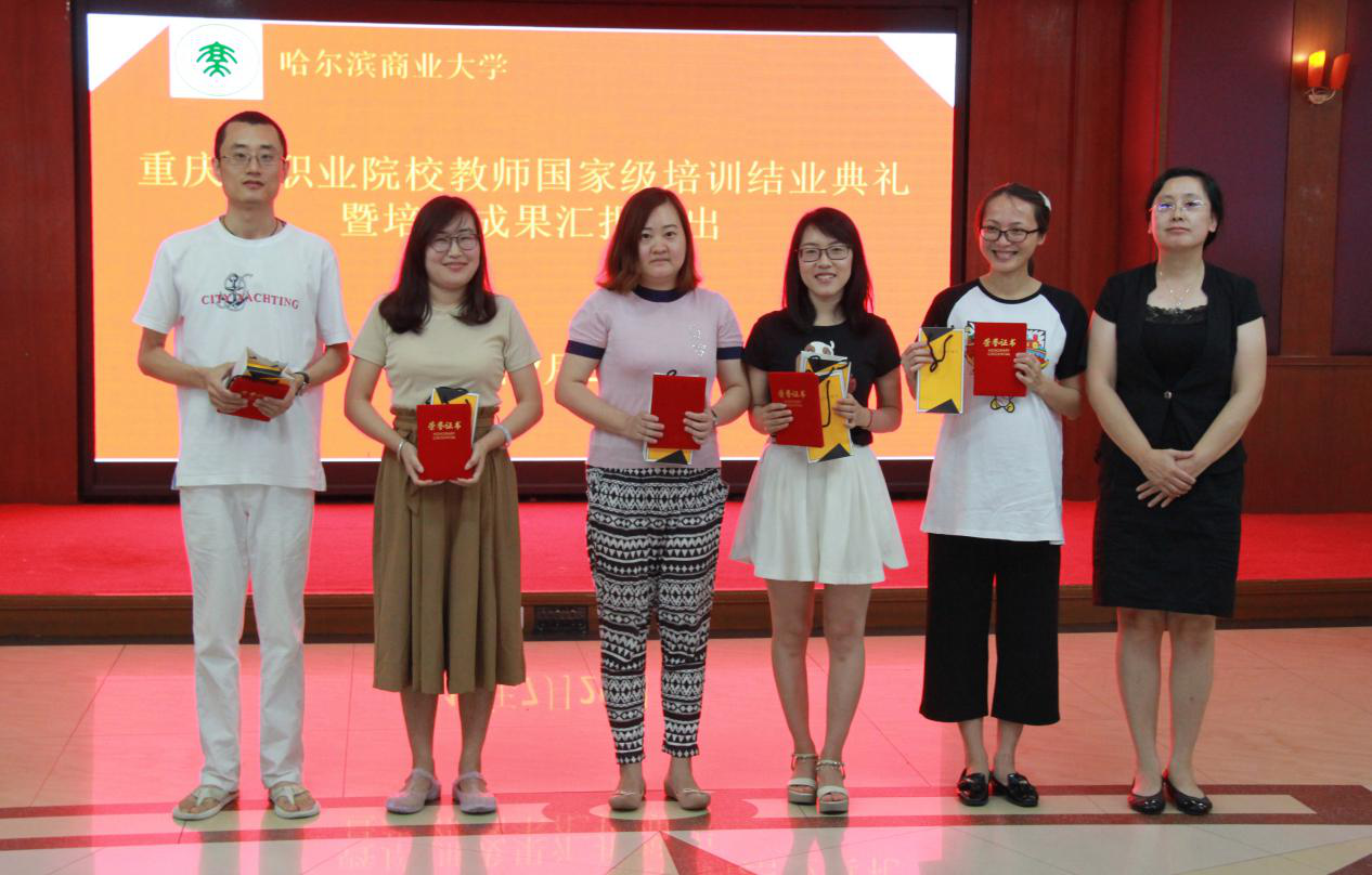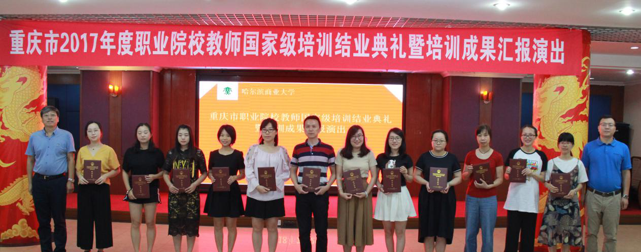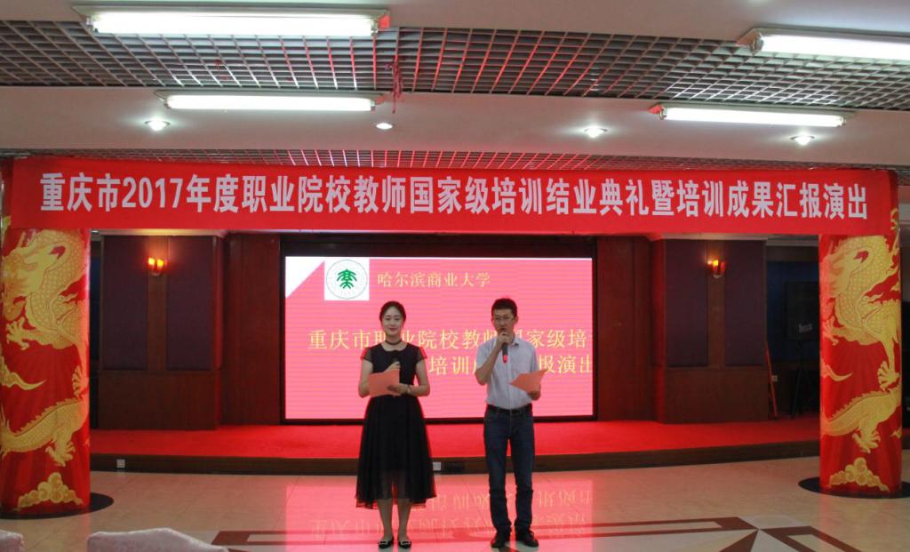 结业典礼暨培训成果汇报演出由视频集锦商大校园风貌、学员报到、开班典礼、专家授课、企业实践、课余生活的精彩瞬间照片和班主任结业寄语拉开了序幕。结业典礼有歌曲、游戏环节、诗歌朗诵等精彩节目。药学院、会计学院领导向重庆市2017年度职业院校国家级培训班的“优秀学员”“优秀班干”和“学习标兵”获奖学员颁发荣誉证书,职业技术教育学院领导为学员代表颁发国家级培训结业证书。