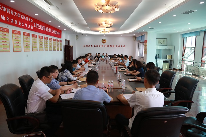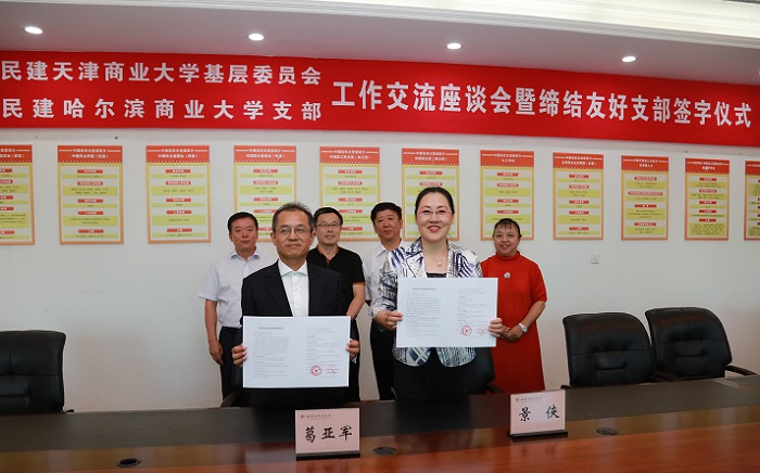 2018年8月22日,“民建天津商业大学基层委员会、民建哈尔滨商业大学支部工作交流座谈会暨缔结友好支部签字仪式”在我校行政楼六楼民主党派会议室隆重举行。民建天津市直属工委主任郭志军及民建天津商业大学基层委员会主委葛亚军一行8人,省政协副秘书长、民建黑龙江省驻会副主委张岭一行3人,哈尔滨商业大学党委书记孙先民、党委副书记杨殿军,统战部部长李滨芬以及校民建支部领导班子和会员代表参加了会议。会议由景侠主委主持。
