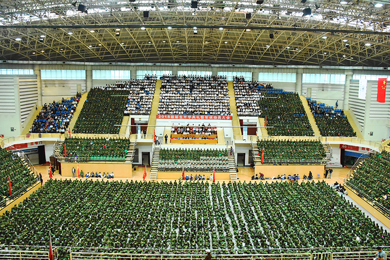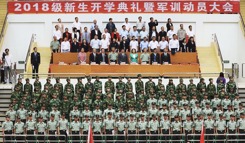 8月25日上午10时,哈尔滨商业大学2018级新生开学典礼暨军训动员大会在A区体育馆举行。