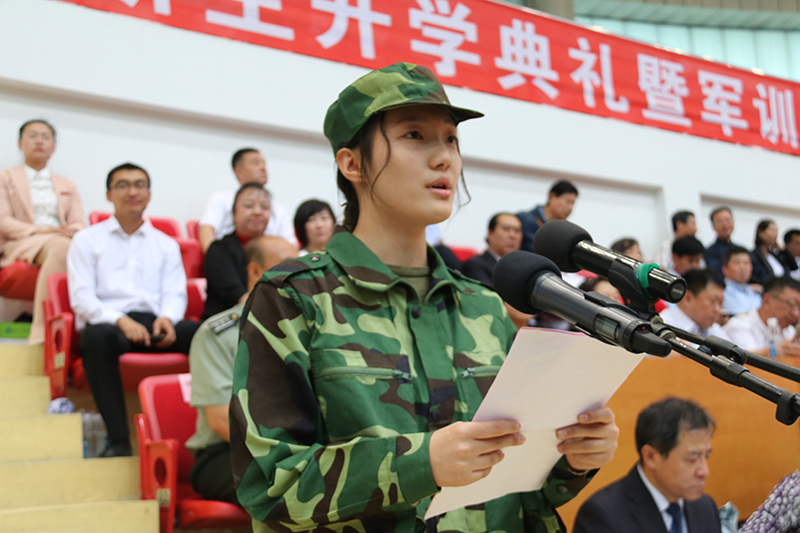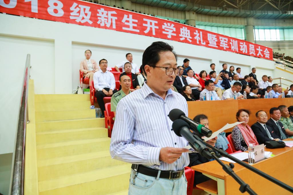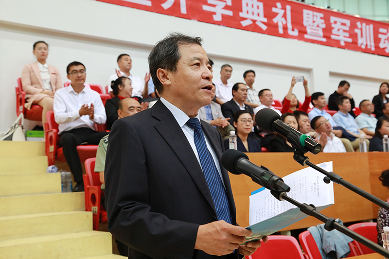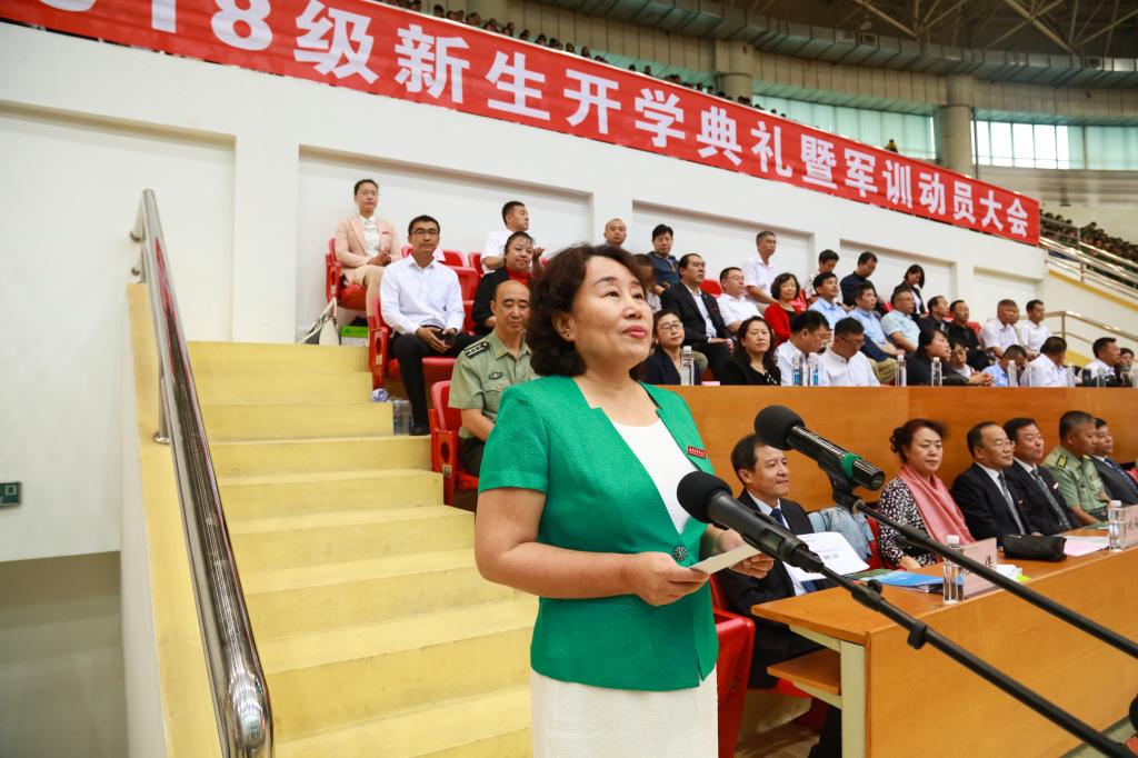 校长、军训师师长郑秋鹛代表学校向新入学的2018级新生表示热烈欢迎,向承担军训任务的教官致以崇高敬意,向培育和支持孩子选择商大的家长表示衷心感谢。