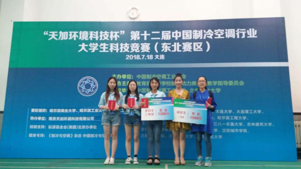 7月17日至18日,第十二届中国制冷空调行业大学生科技竞赛“天加环境科技杯”(东北赛区)在大连理工大学举办。我校能源与建筑工程学院学生苗馨月、闫淑晴、邱雪君和付健在李春颖老师的带领下组成了哈尔滨商业大学代表队,其中李晓燕院长的研究生苗馨月获得了研究生组二等奖的好成绩,三名本科生获得了本科生组三等奖的好成绩。