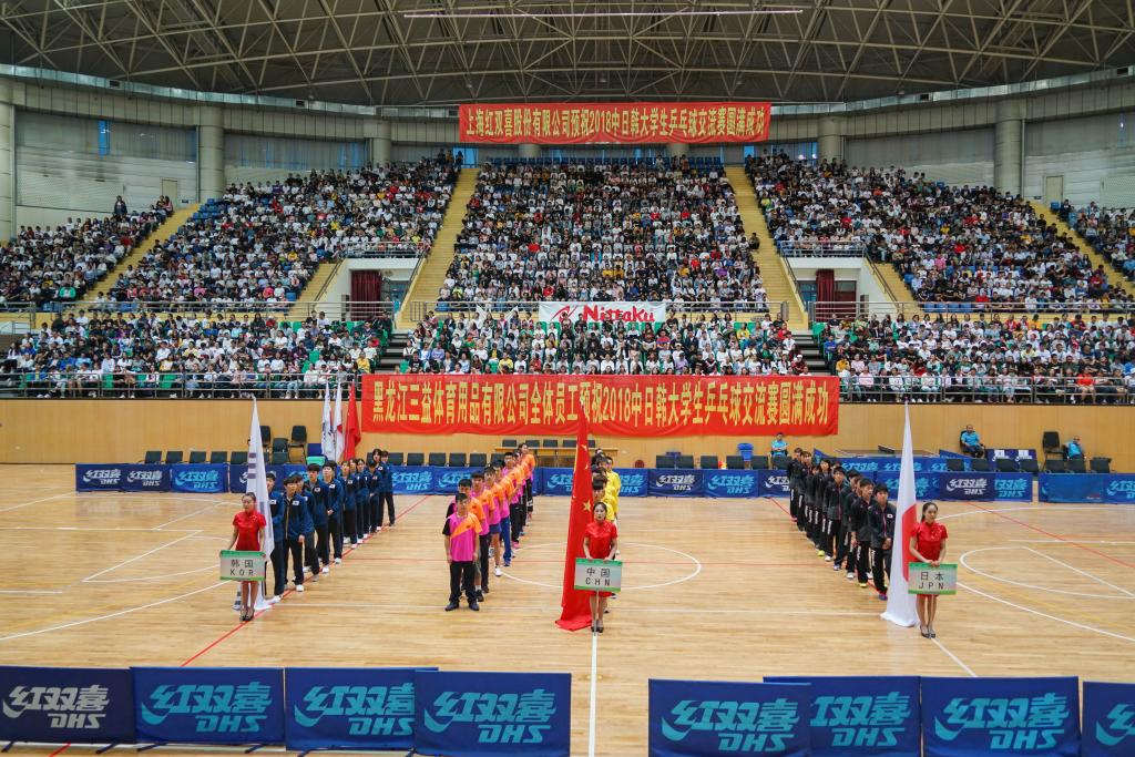 8月28日下午18时,2018中日韩大学生乒乓球交流赛在我校A区体育馆拉开帷幕。中国大学生体育协会副主席、乒乓球分会秘书长孙麒麟,哈尔滨商业大学党委书记孙先民、副校长程伟、工会主席李晓梅,黑龙江省教育厅体育卫生与艺术教育处处长张润林,黑龙江省乒乓球队总教练王飞出席开幕式。