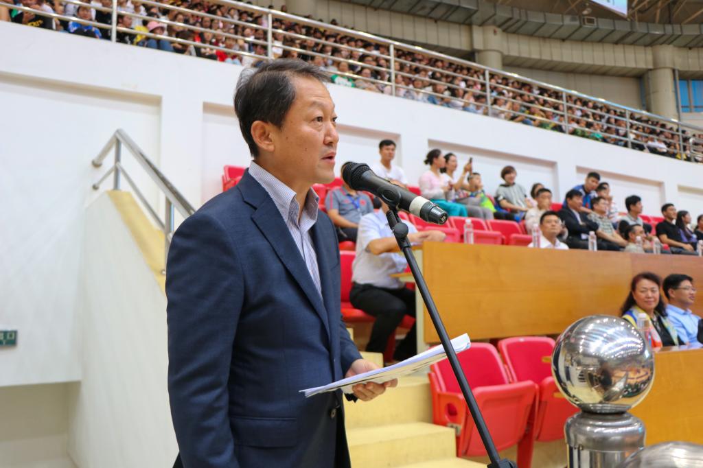 中国大学生体育协会副主席、乒乓球分会秘书长孙麒麟宣布2018中日韩大学生乒乓球交流赛开幕