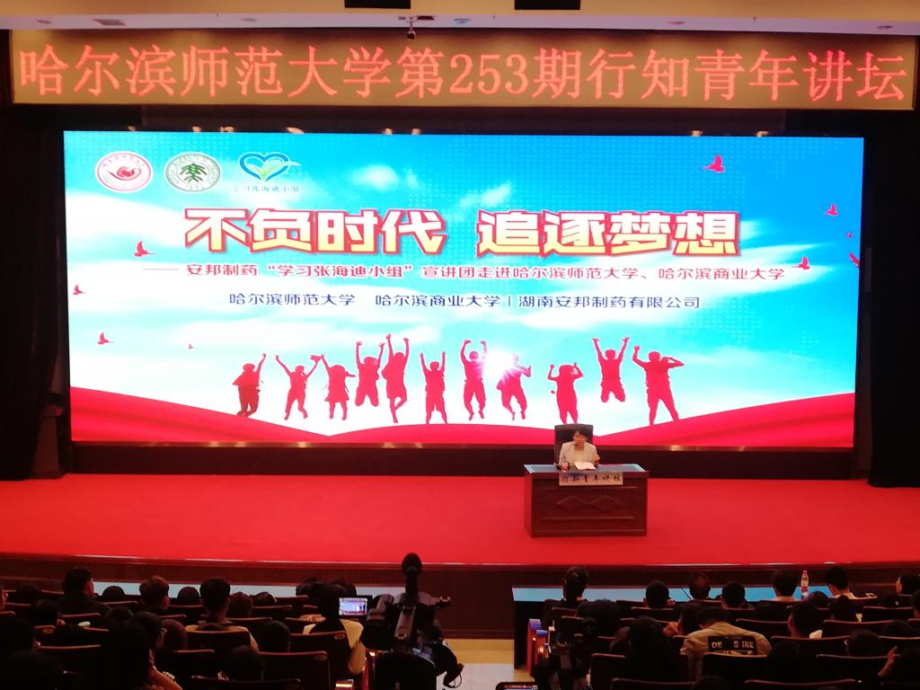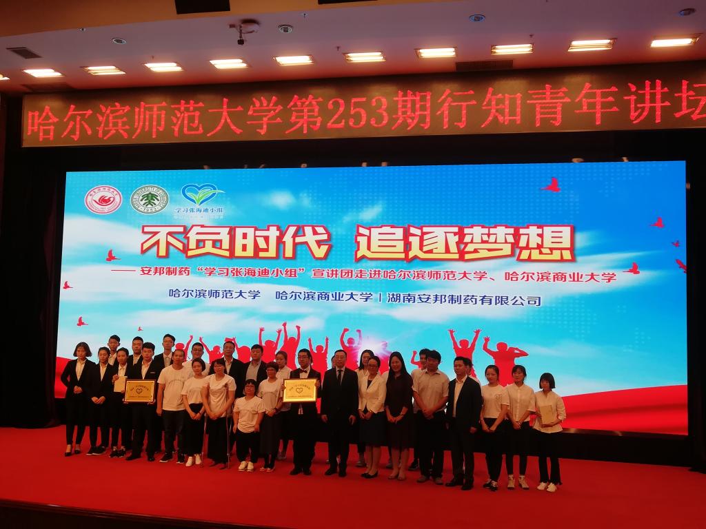 开学季,湖南安邦制药“学习张海迪小组”宣讲团走进黑龙江省大学校园开展残障人士励志教育活动。9月19日晚,宣讲团为哈尔滨师范大学、哈尔滨商业大学两所高校学生进行专场宣讲,活动在哈尔滨师范大学科学会堂举办,我校团委书记王鹤腾带领150名学生到现场参加活动,我校学生被授予“校园学习张海迪小组”称号,并受赠中国残联主席张海迪签名书籍。