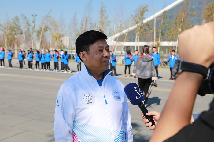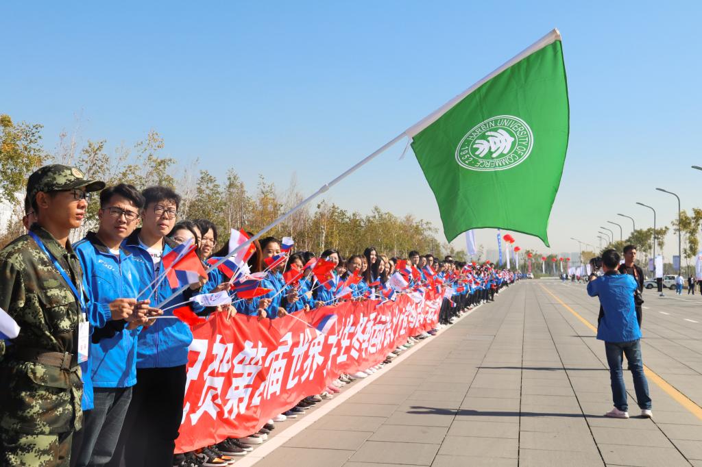 在火炬传递现场,我校学生统一着装,站列整齐,精神饱满,成为一道靓丽的风景线。学生们手持中国国旗、俄罗斯国旗、大运会会旗、哈尔滨商业大学校旗,英姿飒爽、口号高亢,展现了商大学子昂扬向上的精神风貌。圣火传递后,孙先民接受了黑龙江电视台的采访。