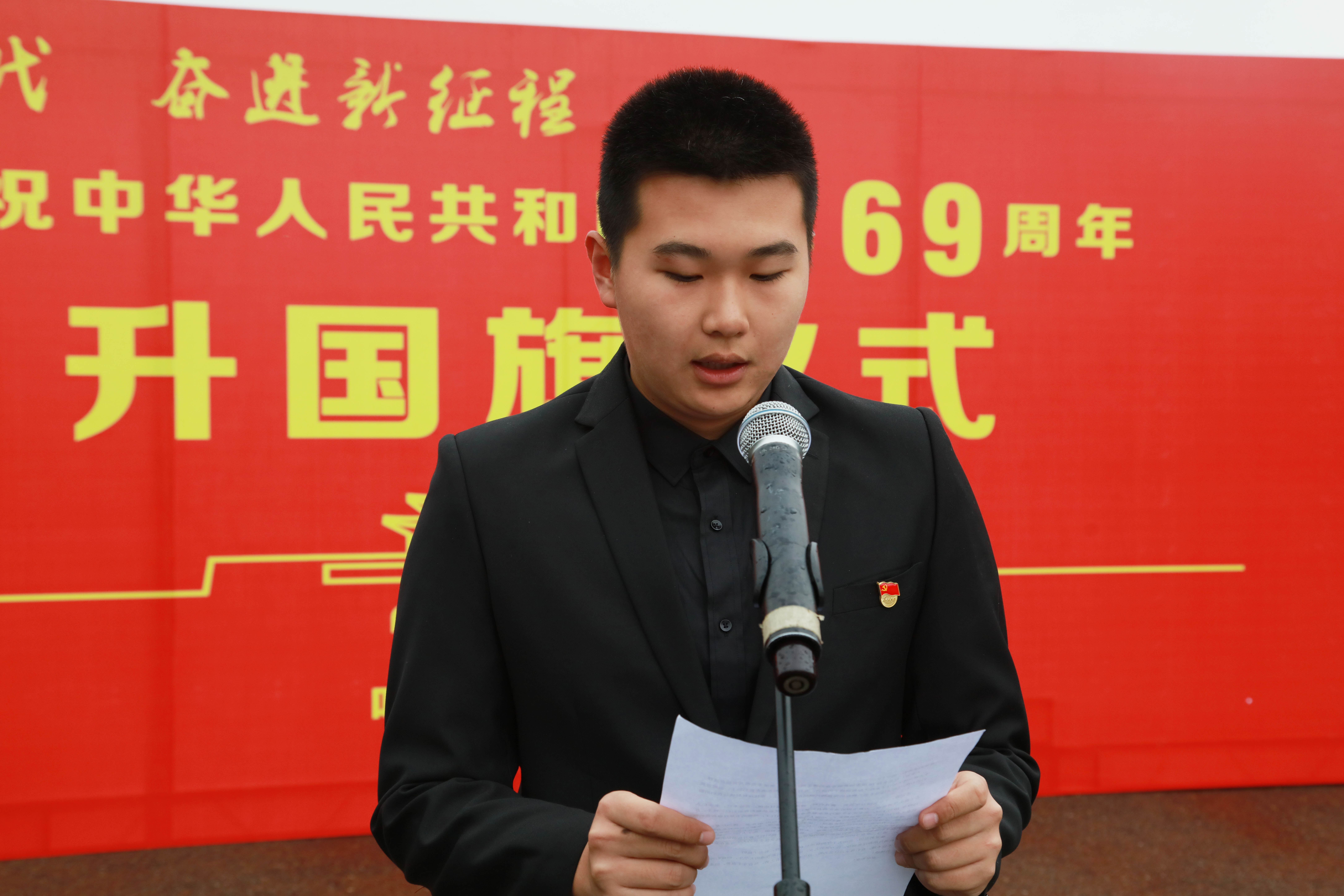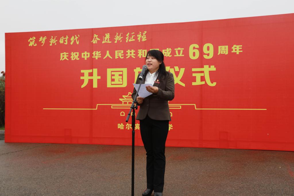 校团委副书记许蕾谈到,今天在祖国母亲69岁华诞来临之际,在我们的校园里和全校师生齐声高唱《义勇军进行曲》感到分外激动与自豪。“前路再远莫忘记,一点初心为谁来”,作为一名青年教师,我们肩负着传播知识、传播思想、传播真理,塑造灵魂、塑造生命、塑造新人的时代重任。就在前几日,习近平总书记到我省考察,并发表了重要讲话,作为龙江儿女,我们要深入学习领会习近平总书记关于东北振兴的重要思想,在新一轮东北振兴的历史机遇面前,为书写好实现中华民族伟大复兴中国梦的龙江篇章而贡献自己的力量。