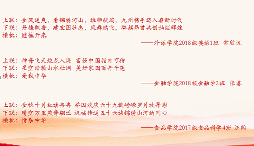 为培养青年学生的爱国主义情怀,激励广大青年学生用最真挚的情感和最实际的行动来表达对祖国的热爱,校团委于近日在全校范围开展了“齐心迎国庆 共抒爱国情”主题活动。自活动开展以来,全校学生积极投稿,踊跃参与,各学院团委共推荐优秀对联作品174副、摄影作品144幅。在经过严格审核、筛选、评定之后,共有132名同学的参赛作品脱颖而出,12个学院团委获得组织奖和优秀组织奖。