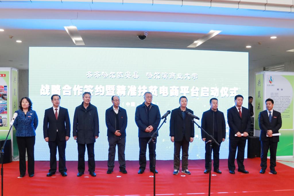 依安县委书记李拥军指出,哈商大领导班子、全体教职员工、扶贫工作队对依安县倾力帮助、全力帮扶,与50万依安人民合力攻坚,终于取得了脱贫攻坚战的关键性胜利,依安县于今年八月摘掉了省级贫困县的帽子。李拥军表示,依安县与哈商大共谋发展愿景,共建合作平台,努力将依安县打造成为哈商大的科研基地、实验基地、实践基地,全力形成高校有位、政府有为、企业有需、合作有果的良好格局。他希望“精准扶贫电商平台”成为社会认可的菜篮子、农村贫困户增收的聚宝盆、校地共同发展的助推器。