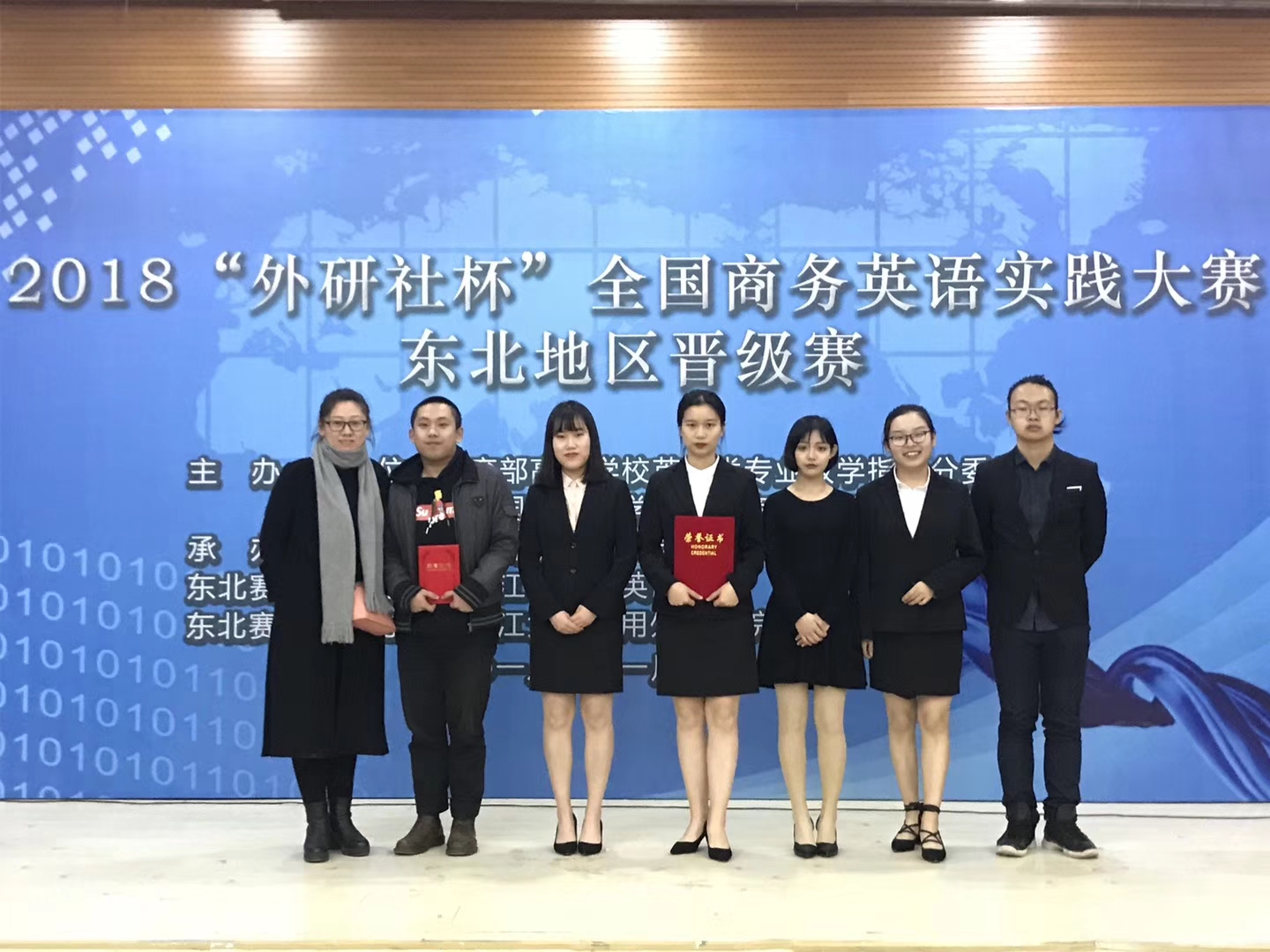 在2018“外研社杯”全国商务英语实践大赛东北赛区晋级赛中,我校外语学院商务英语专业2016级的唐超、何羽、孟祥熙及2017级的李依依、刘嘉玲5名同学组成的HUC Waves团队荣获东北赛区二等奖。