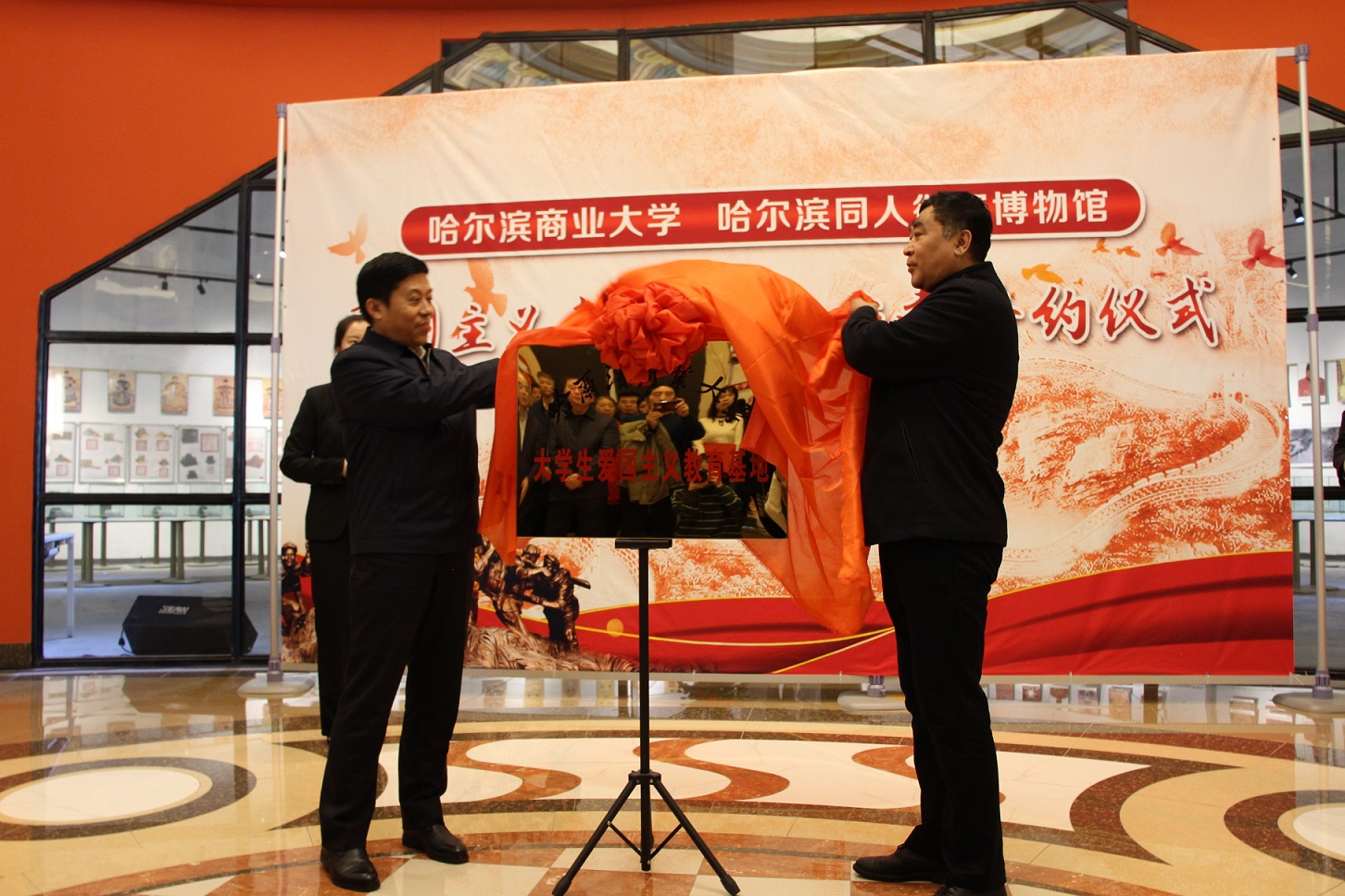 校党委书记孙先民与哈尔滨同人御玺博物馆馆长徐兴杉共同为“大学生爱国主义教育基地”揭牌