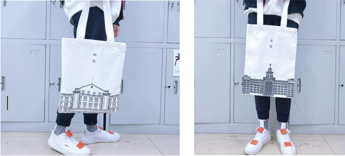 Å纪念帆布袋是将哈尔滨商业大学北区主楼与南区主楼用版画形式进行设计表现,以帆布袋的形式进行实物效果表达,符合当代当今消费者追求的简约实用的消费理念。