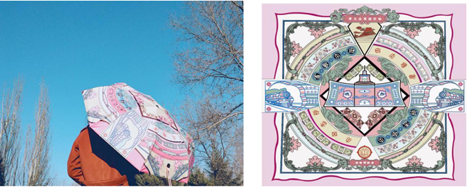 Å系列纪念丝巾和纪念雨伞以哈尔滨商业大学的标志性建筑物进行图形化,以二方连续的形式进行设计表达,再与哈尔滨商业大学货币金融博物馆珍藏货币的元素相结合设计。