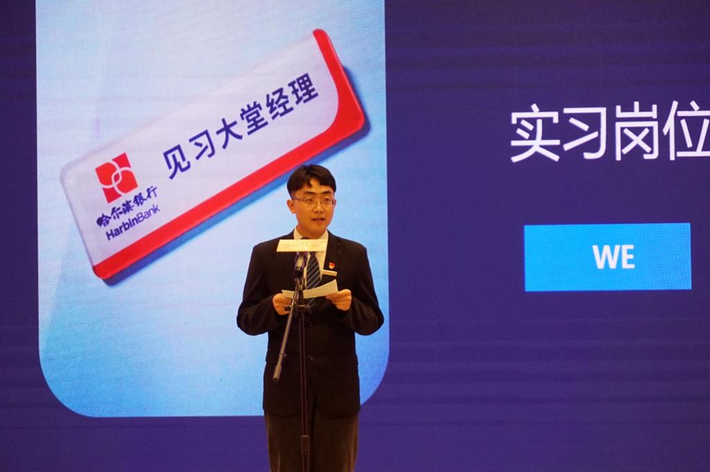 共青团黑龙江省委书记苑芳江、哈尔滨银行党委书记、董事长郭志文为我校获奖学生代表颁发证书