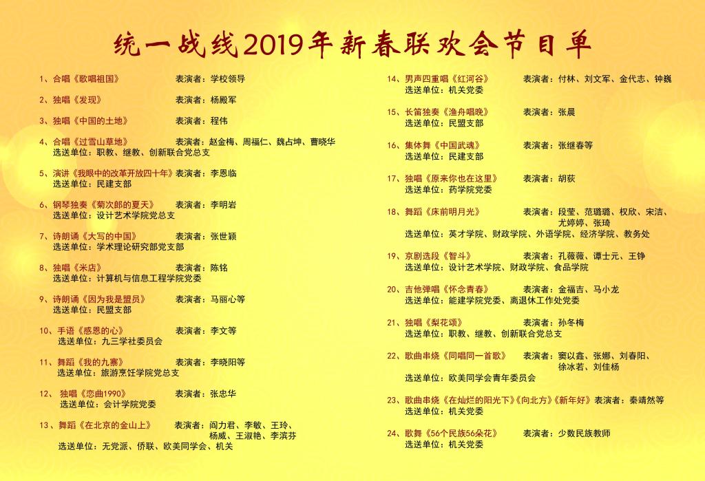 机关党委歌曲串烧《新年好》、欧美同学会青年委员会歌曲串烧《同一首歌》,表达了商大师生同颂新时代、共铸新辉煌的深情祝福。