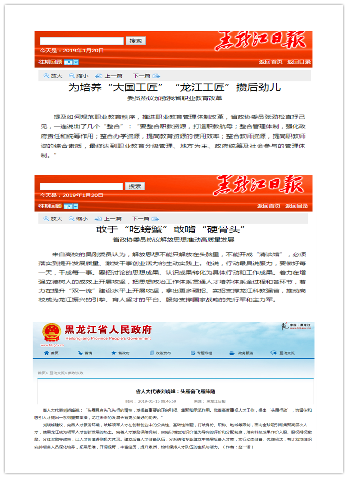 省政协十二届二次会议和省十三届人大三次会议分别于1月13日—1月16日、1月14日—1月18日在哈尔滨召开,我校党委书记孙先民、研究生学院院长项义军、会计学院院长张劲松、基础科学学院吴刚作为政协委员参会,校长郑秋鹛、科研处处长刘晓峰作为人大代表参会。“两会”期间,我校的代表、委员认真履职,积极发声,围绕养老产业、人才培养、东北区域物流圈培育、头雁行动、哈尔滨新区发展等关乎龙江人才、民生、金融、经济等领域的问题,提交了一批高质量的提案和议案,受到各大新闻媒体广泛关注。人民网、黑龙江省新闻联播、黑龙江日报、东北网等多家媒体对我校代表、委员建言献策、参政议政情况进行了采访和报道,累计宣传报道近20条(次)。