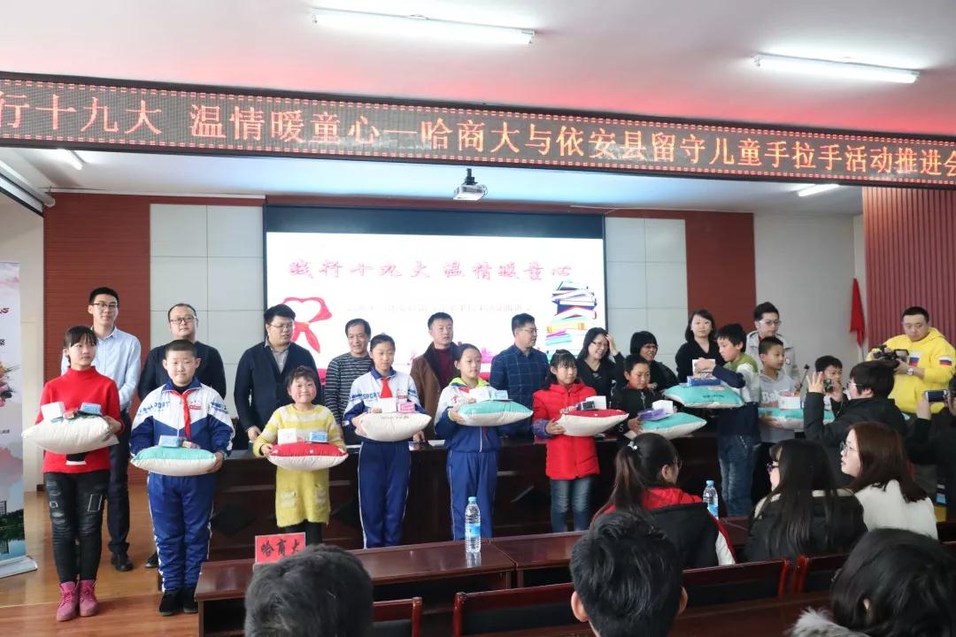 2018年,哈尔滨商业大学积极响应国家精准扶贫及关爱留守儿童的号召,依托学生组织骨干,组建了由校院两级200余名志愿者组成的“大手拉小手”情暖童心志愿服务团队。团队先后3次深入齐齐哈尔市依安县6所中小学,20余个村屯,开展走访慰问、心理关爱、课业辅导、假期看护等形式的帮扶活动20余次,先后捐赠学习生活用品1000余件,为依安县第三小学带去了“希望工程•小喇叭故事汇”项目,并为当地从事中小学心理辅导工作的教师进行专业培训。学校团委结合实际情况将学校负责的2000余名留守儿童对接到18个学院的338个团支部,开展长期远程课业辅导及心理关爱帮扶活动,并在全省高校中首创团支部对接帮扶形式。