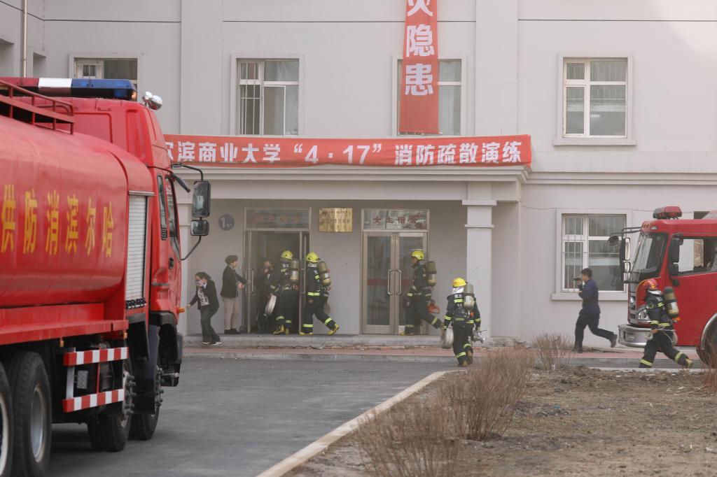 4月17日是我市消防宣传日,上午9时,我校联合松北区消防大队、太阳岛中队在学校20公寓进行消防安全逃生演练。此次演练是我校消防安全活动的一项重要内容。松北区消防大队吕杨参谋、哈尔滨商业大学校长郑秋鹛、副校长于树彬及学校相关部门领导参加了演练活动。共有600余名师生参与观摩。