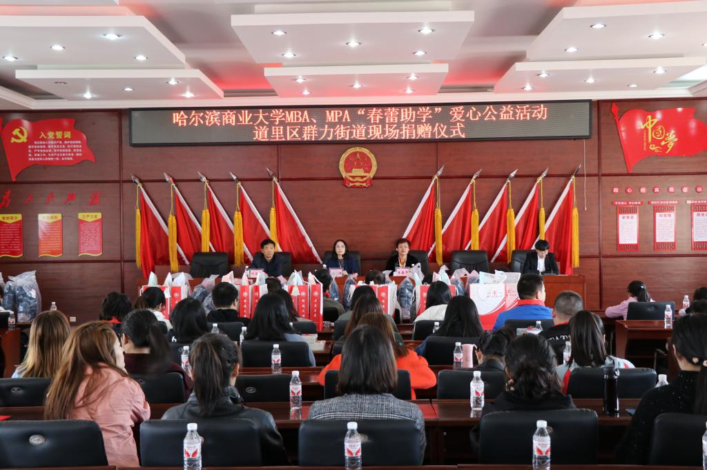 4月21日,我校MBA、MPA师生50余人赴群力街道办举行“春蕾助学”爱心捐赠仪式,共有27名小学生受到了资助,哈尔滨市道里区妇联主席王春华,群力街道办事处党委副书记刘宝庆,我校MBA、MPA学院院长宋晓洪教授出席本次活动。