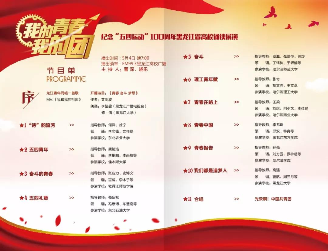 近日,由共青团黑龙江省委员会、黑龙江省学生联合会、黑龙江广播电视台主办,团省委学校部、黑龙江高校广播承办的“我的青春·我的团”——纪念五四运动100周年黑龙江省高校诵读展演活动在哈尔滨学院音乐厅举行。经过层层选拔,共有来自全省各地市的十所高校参加了诵读展演活动。由我校团委选送、基础科学学院团委创作表演的原创诵读作品《青春•在路上》入围本次展演活动。