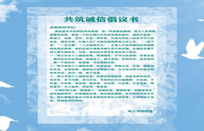轻工学院、基础科学学院、管理学院等学院通过发起诚信倡议书,号召全体同学将诚信作为“立身之本”,积极树立“做诚信人、说诚信话、办诚信事”的诚信观念。引导同学们从自我做起,从小事做起,知荣明耻,培养诚实守信的道德品质,养成诚信待人,诚信处事,诚信学习,诚信立身的良好习惯,以实际行动带动周围同学,相互监督,共同进步,争做新时代诚信大学生,共同塑造商大学子良好诚信形象。