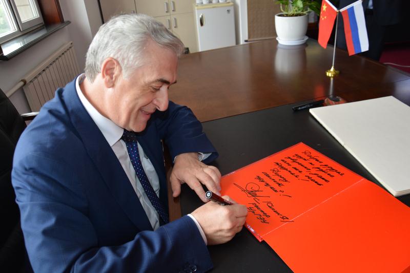 会谈结束后,西林·雅科夫校长在留言簿留言。赵春雨陪同参观了学校校园和新教学综合楼。