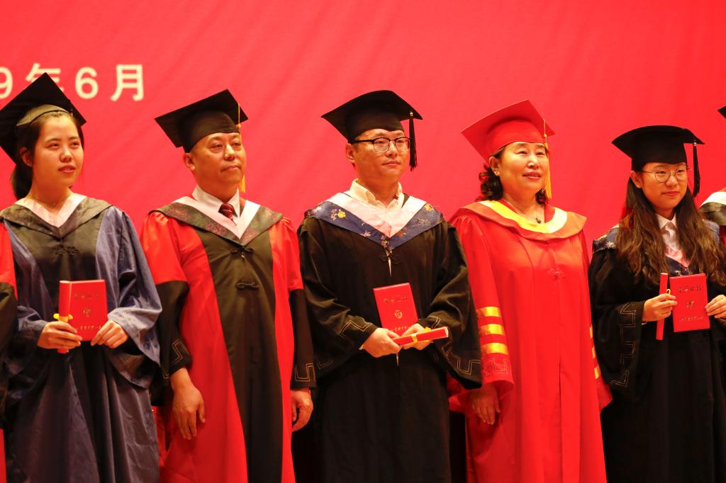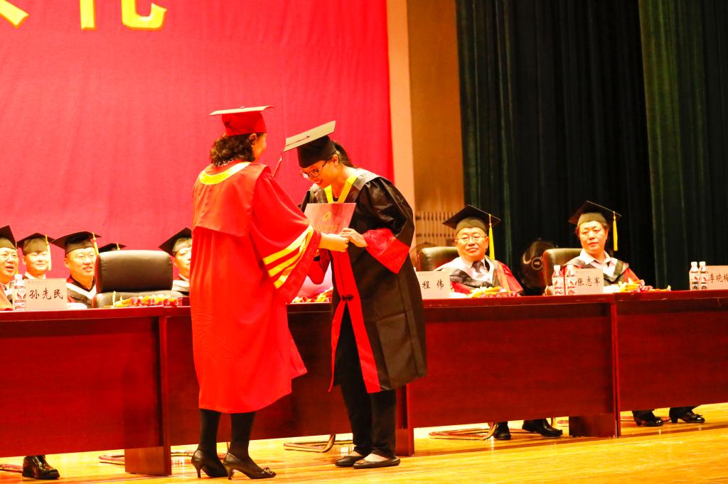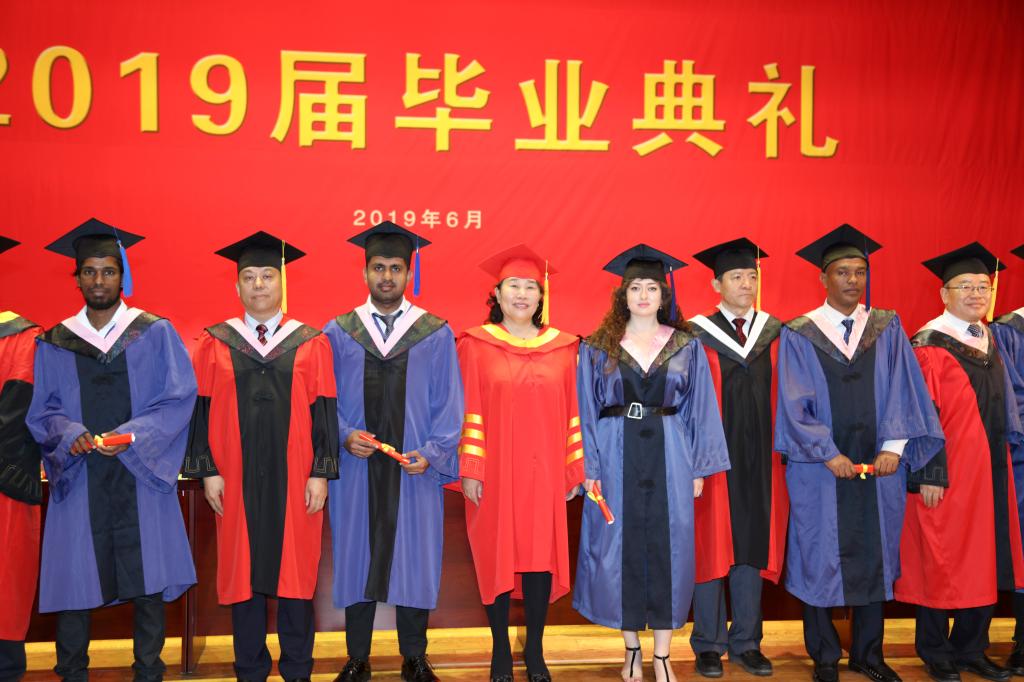 校学位评定委员会委员代表和校领导为获得硕士学位的毕业留学生颁发学位证书