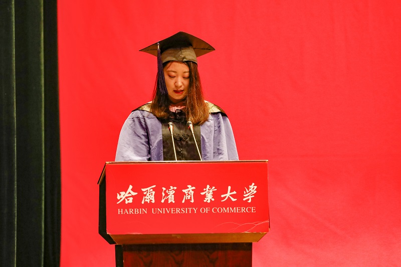 毕业生代表、2016级行政管理硕士研究生王盼代表毕业生向母校、师长表达了最深挚的敬意和谢意,追求真理、崇尚学术、勤勉坚韧、诚信笃行的商大精神是学校赠予他们最为珍贵的礼物,是商大人独有的记忆。她郑重表示,将会用一生去诠释“求真至善,修德允能”的校训,用行动和奋斗书写无愧于新时代、无愧于商大人的华彩篇章。