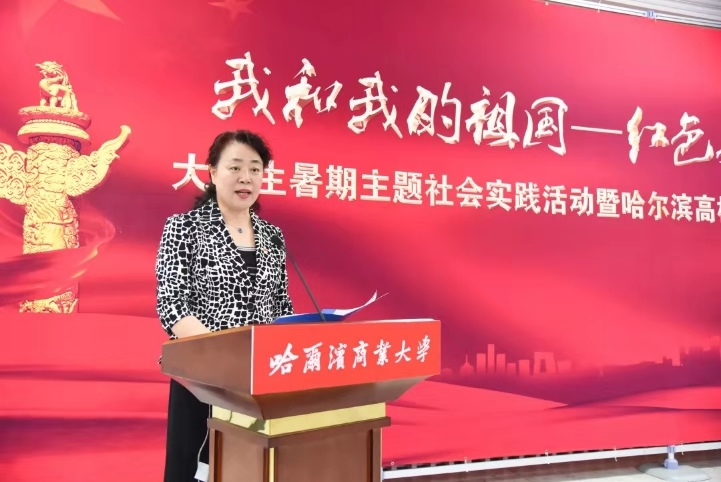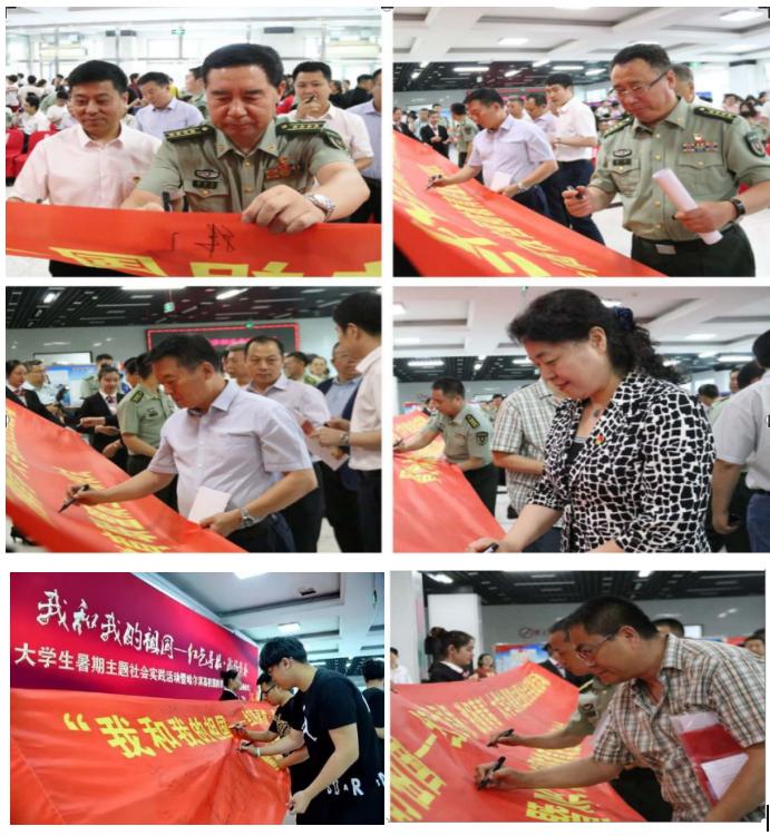团省委副书记张涛、省委宣传部国防教育办主任冯绍欣、省教育厅体卫艺处副调研员李建民、市委宣传部副巡视员赵小光、团市委副书记王洪新、哈尔滨商业大学党委副书记杨殿军为参加主题社会实践活动的各高校实践团队代表授旗。