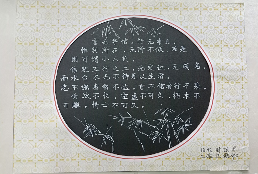 根植传统文化,寄意书画作品,诚信文化浸润心田。财政与公共管理学院、金融学院、食品工程学院、设计艺术学院等12个学院积极组织开展诚信书画作品评选展示活动,围绕诚信主题书写诚信诗词、名人名言、自勉警句,绘制诚信历史故事、诚信漫画等内容,共征集优秀书画作品230幅。各学院在大力开展诚信文化教育的同时,引导广大青年学子坚定文化自信,借助中华传统书画艺术之笔,颂扬诚信为本的中华民族传统美德,汲取中华优秀传统文化鲜明的民族特色,传承中华优秀传统文化永不褪色的时代价值。