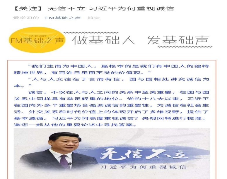 习近平总书记在纪念五四运动100周年大会上发表的重要讲话中指出,新时代中国青年要锤炼品德修为,要把正确的道德认知、自觉的道德养成、积极的道德实践紧密结合起来,不断修身立德,打牢道德根基,在人生的道路上走得更正、走得更远。我校共青团将以诚信主题教育作为一项重点工作常抓不懈,引导广大青年学生锤炼品德修为,秉承“求真至善,修德允能”校训,争做诚信教育的宣传者,诚信行为的践行者。