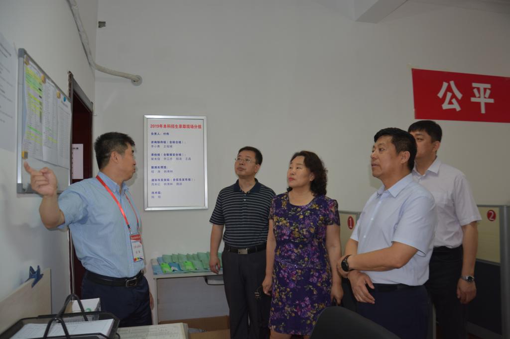7月18日上午,校党委书记孙先民、校长郑秋鹛深入我校本科招生录取现场,检查、指导2019年本科招生录取工作,并慰问坚守在招生一线的工作人员。办公室、教务处和学生处等职能部门负责人陪同检查、指导。