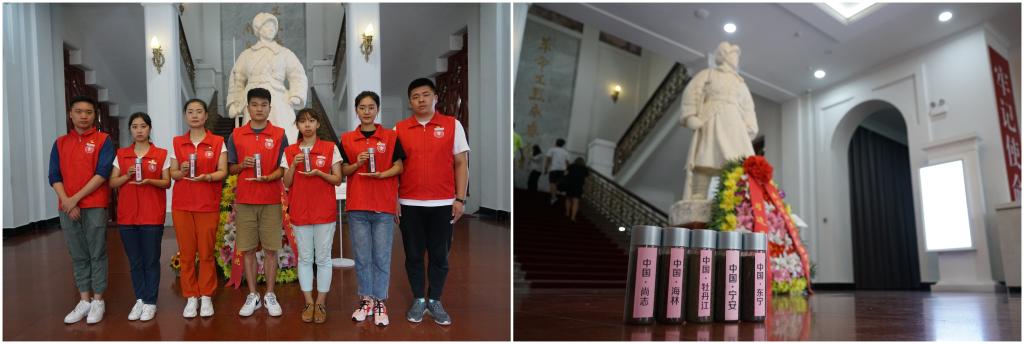 7月15日,实践团回到了本次活动的出发地哈尔滨。实践团成员带着从抗联英烈战斗过的地方收集的泥土,来到东北烈士纪念馆。这些泥土分别采自赵一曼烈士牺牲地尚志、杨子荣烈士墓所在地海林、“八女投江”战斗过的地方牡丹江、马骏烈士的故乡宁安以及东宁抗联英雄园。这一抷看似普通却饱含抗联英烈初心和使命的泥土,寄托着无数仁人志士、革命先烈的理想和夙愿,正是这被鲜血浸染过的黑土地滋养着今天的我们,惟愿所有英烈们都能听到盛世告慰的声音。