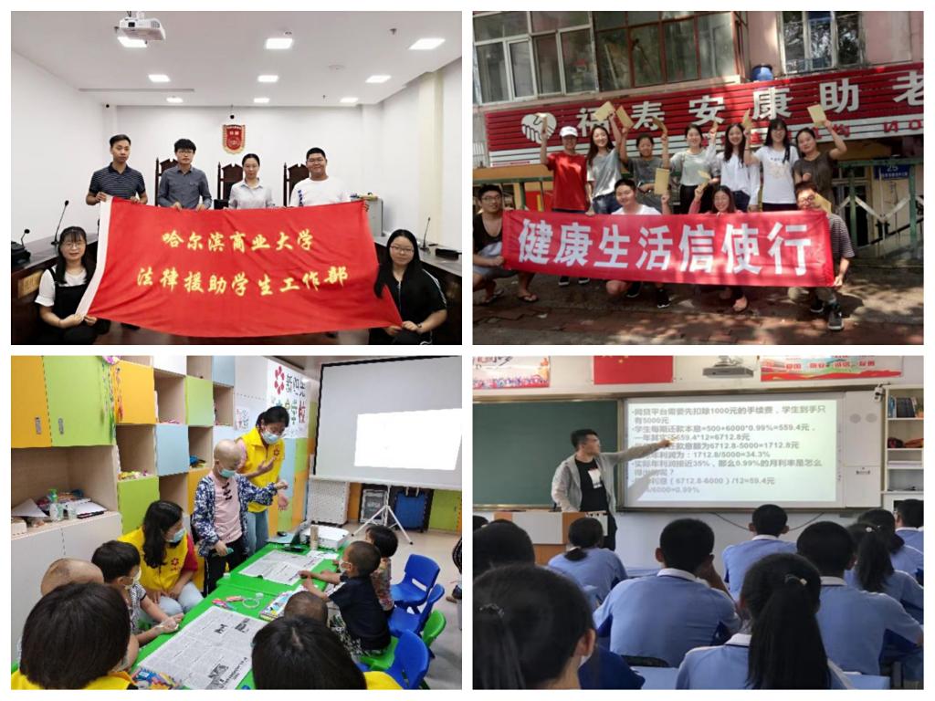 校法援工作部暑期实践团队走进哈尔滨市劳动人事争议仲裁委员会,深入立案审监庭、劳动关系庭和社会保险庭开展专业实践活动。会计学院连续多年组建团队开展关爱自闭症儿童和白血病儿童活动,“蓝色星空”团队成员赴内蒙古和陕西开展关爱自闭症儿童活动,“白色阳光”团队成员分别在重庆、南京、上海、广州等地开展关爱白血病儿童活动。法学院组建“依法治国”宣讲团赴牡丹江地区开展普法宣传活动。药学院“健康信使团”结合专业特色,以“飞鸽说膳语,教您健康饮食”为主题走进走进绥化市明水县养老院、老年公寓开展中医养生文化知识宣传。药学院“扬中医药文化之帆”团队走进哈尔滨中医药大学、哈尔滨医科大学、牡丹江医学院、齐齐哈尔医学院,开展大学生对中医药文化的认知情况调查。管理学院预防“套路贷、校园贷”知识讲堂团队到绥芬河市高级中学开展预防不良网络贷款安全教育宣讲活动。旅游烹饪学院文化宣讲团到哈尔滨第二十四中学开展特色旅游文化及饮食文化宣讲活动。旅游烹饪学院“爱心小分队”走进哈尔滨市方正县特殊教育学校为特殊学校儿童送温暖。体育学院教育关爱服务团前往哈尔滨儿童福利院开展志愿服务活动。旅游烹饪学院“夕阳红老年服务队”到老年公寓进行慰问演出。外语学院“爱驻夕阳”团队前往老年公寓开展敬老爱老志愿服务活动。商务学院“传递爱心”小分队走进敬老院开展慰问活动。外语学院、商务学院、职业技术教育学院分别组建团队就近开展河道垃圾、城市生活垃圾的义务清理活动。