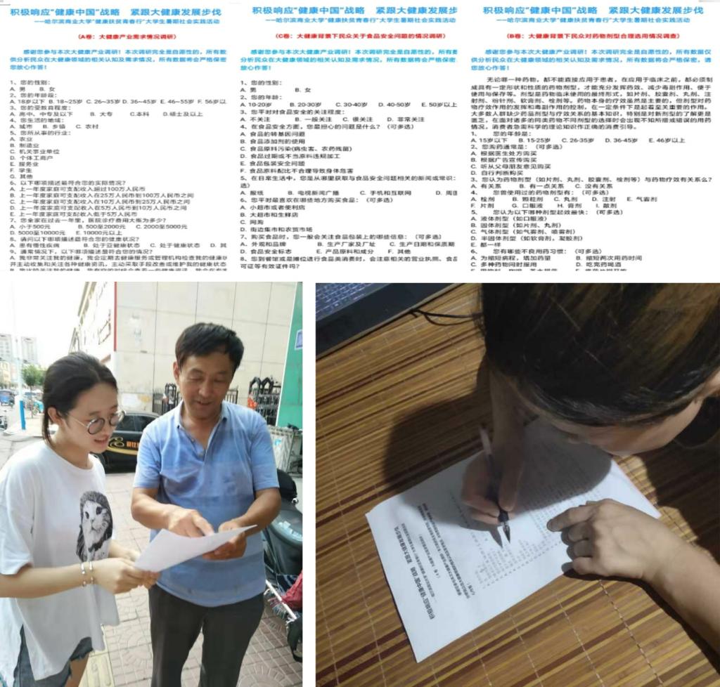 药学院、食品工程学院、英才学院组建专项活动实践团队以“大健康产业需求情况”“大健康背景下民众对药物剂型合理选用情况”“大健康背景下民众关于食品安全问题的情况”三套调研问卷为切入点,开展大健康专题调研,结合调研情况,进行问卷结果分析,有针对性地开展中医养生、合理膳食、食品安全、用药安全等健康知识宣讲活动;全校其他社会实践团队在活动开展过程中,同时辅助进行大健康专题问卷调研,以扩大调研数据采集的样本量、样本涵盖范围。